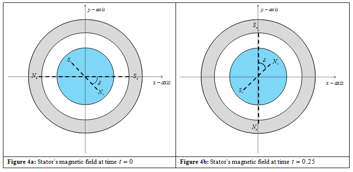 Now an important question that arises is how to create continuous magnetic torque ? To produce continuous torque the magnetic field of the stator should rotate continuously. As a result, the rotor's magnetic field will chase the stator's magnetic field and this result in production of continuous torque. This phenomenon is illustrated in Figures 4a - 4d. In Figure 4 a two pole machine is depicted and the rotors magnetic field is created by the permanent magnets. It is assumed that the stator's magnetic field rotates at a speed of 60 revolutions per minute (60 rpm) which is equivalent 1 revolution per second (1rps). To start the analysis it is assumed that at time t=0, the stator's magnetic field axis aligns itself with the x− axis and the rotor's magnetic field axis makes an angle δ with the stator's magnetic axis (Figure 4a). At time t=0.25s, the stator's magnetic field moves by 90° and the rotor's magnetic field chases the stator's field and aligns as shown in Figure 4b. Similarly the locations of the magnetic field axis at time t=0.5s and t=0.75s are shown in Figures 4c and Figure 4d .