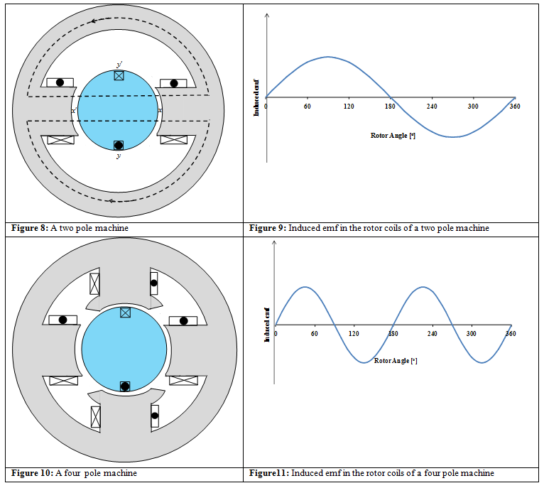 In Figure 8, it is assumed that the field winding is excited by a dc source and a coil rotates in the air gap at a uniform angular speed. When the conductor is aligned along y - y' axis, the e.m.f induced is zero. Along x - x' axis the induced e.m.f is maximum. In one revolution of the coil, the e.m.f induced is shown in Figure 9. If the same coil rotates in a 4 pole machine (Figure 10), excited by a dc source, the variation in the magnetic flux density and the induced e.m.f is shown in Figure 11. From Figure 11 it can be seen that in one revolution of 360 mechanical degrees, 2 cycles of e.m.f (720 electrical degrees) are induced. The 720 electrical degrees in a 4 pole machine can be related to 360 mechanical degrees as follows