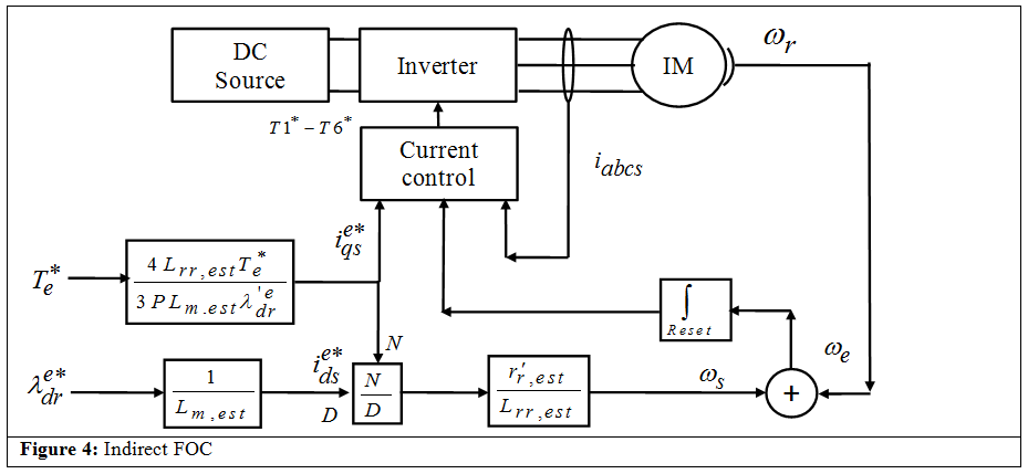 The solution of equations 37 and 38 will decay to zero (same argument as used for equation 12 ), hence λeqr and ieqr will eventually become zero. In Figure 4 the implementation of indirect FOC is shown and it is much simpler than the direct FOC .
