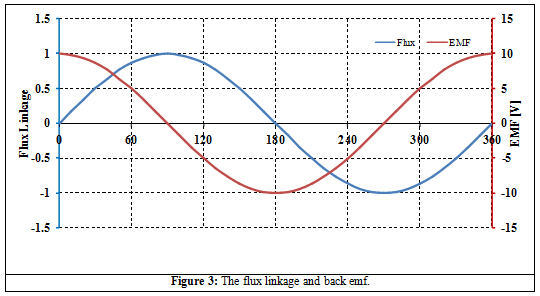 As the coils in the stator experience a change of flux linkages caused by the moving magnets, there is an induced emf in the windings. The shape of the induced emf is very dependent on the shape of the flux linkage. If the rotational electrical speed of the machine ωr and the air gap flux is sinusoidal then it can be expressed as (Figure 3)