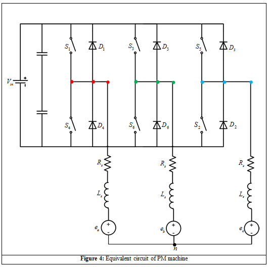 The equivalent circuit of the PM machine motor is shown in Figure 4. When the motor is operated in 120° then at given point of time only two switches conduct and six switching combinations are possible. The gating signals are shown in Figure 5. At angle