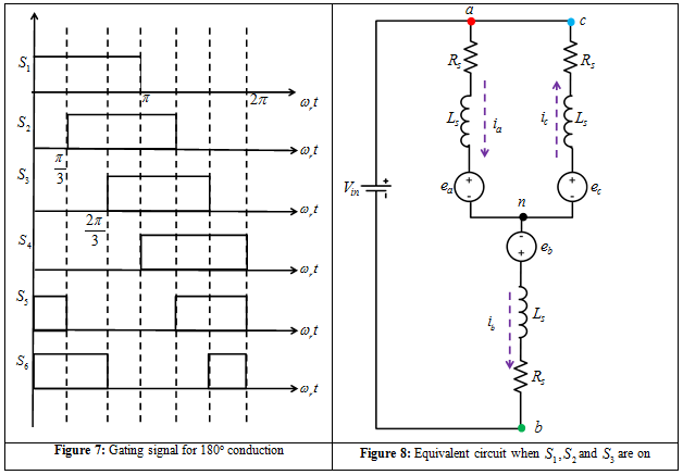 In this mode of operation at any point of time at least three switches are on. The gating sequence for this mode of operation is shown in Figure 7. The equivalent circuit of the PM machine, when switches S1, S5 and S6 are on, is shown in Figure 8. The set of equations defining the circuit configuration in Figure 8 is