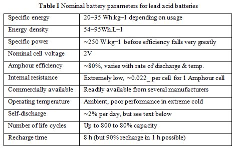 The lead acid battery is the most commonly used rechargeable battery in anything but the smallest of systems. The main reasons for this are that the main constituents (lead, sulphuric acid, a plastic container) are not expensive, that it performs reliably, and that it has a comparatively high voltage of about 2V per cell. The overall characteristics of the battery are given in Table I .