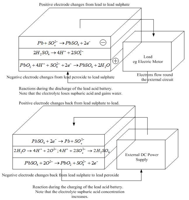When being charged, as in the lower half of Figure 2 , the electrodes revert to lead and lead dioxide. The electrolyte also recovers its sulphuric acid, and the concentration rises.