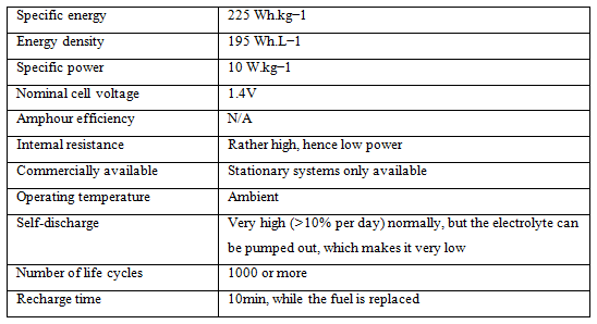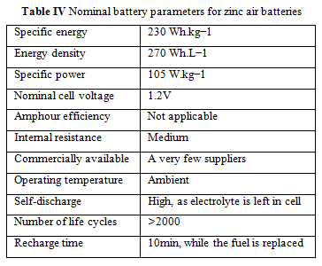 The battery is recharged by replacing the used negative electrodes. The electrolyte will normally also be replenished, as it will be contaminated with the aluminium hydroxide. The essential characteristics of the aluminium air battery are shown in Table III. The big drawback of the aluminium air battery is its extremely low specific power.