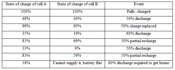 Table I Showing the state of charge of two different cells in a battery. Cell A is a good quality cell, with low self-discharge. Cell B has a higher self-discharge, perhaps because of slight manufacturing faults, perhaps because it is warmer. The cells are discharged and charged a number of times