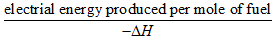 If there are no losses in the fuel cell, or as we should more properly say, if the process is reversible, then all this Gibbs free energy is converted into electrical energy. We could thus define the efficiency of a fuel cell as: