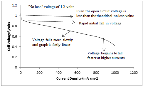 In practice the actual cell voltage is less than this. Now of course this applies to ordinary batteries too, as when current is drawn out of any electric cell the voltage falls, due to internal resistances. However, with a fuel cell this effect is more marked than with almost all types of conventional cell. Figure 6 shows a typical voltage/current density curve for a good PEM fuel cell. It can be seen that the voltage is always less, and is often much less, than the 1.18V that would be obtained if all of the Gibbs energy were converted into electrical energy.