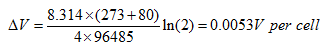 However, in practice the voltage increase would typically be about 0.04 V, nearly ten times as much. Even so, we should note that the increase is still not large, and that there is considerable energy cost in running the system at higher pressure. Indeed, it is shown elsewhere that the energy gained from a higher voltage is very unlikely to be greater than the energy loss in pumping the air to higher pressure.