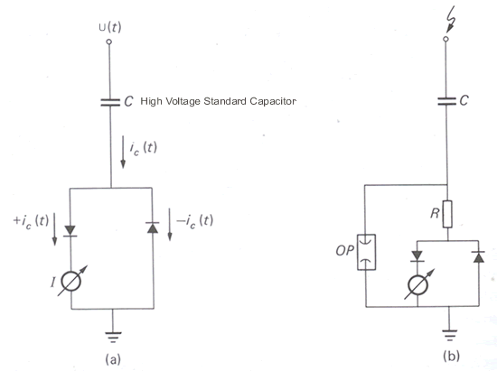 A number of rectifier circuits have been proposed for the measurement of peak value of ac power frequency and impulse voltages to work with capacitive voltage dividers. The first circuit of its kind was proposed by Davis, Bowdler and Strandring in 1930, shown in Fig 30.4