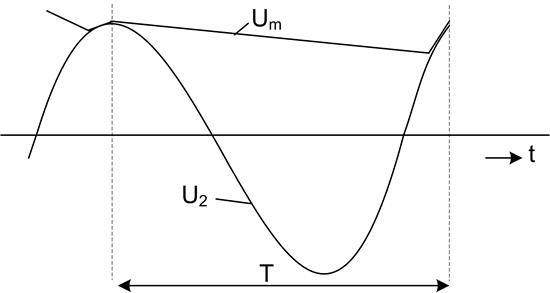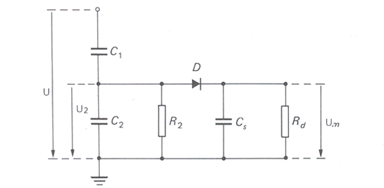 In this circuit, the measuring capacitors Cm is charged to the peak value , the lower arm voltage of the capacitive voltage divider. If U2 is decreased, Cm will hold the charge and the voltage across it will not change. Because of the reverse bias current of the diode, there is a danger that U2 will gain negative dc component over the time. Hence Um will no longer follow the change in U2 . Therefore, discharge resistors R2 and Rd must be included in this circuit. The time constant RdCm should be between 0.5 - 1 sec to obtain a good response. When the circuit response conditions are taken care, the peak value of the voltage to be measured is given by the relation