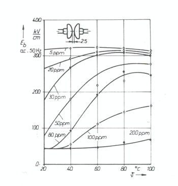 Power frequency ac breakdown voltage/ field intensity of transformer oil samples having different moisture content were measured by Holle [3.2] with increasing temperature according to the standard method described above, Fig.20.2 |