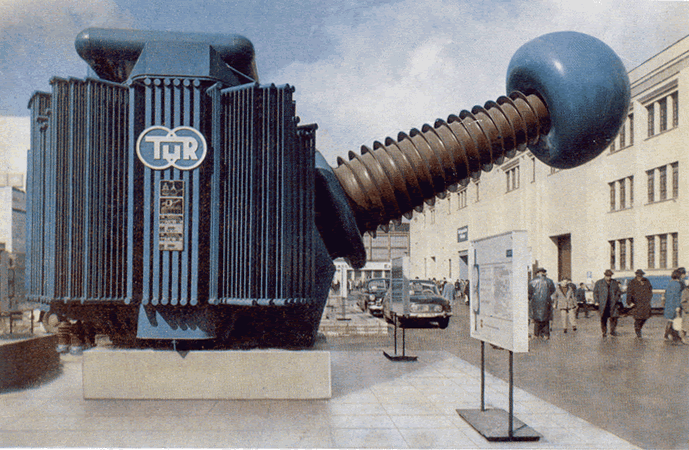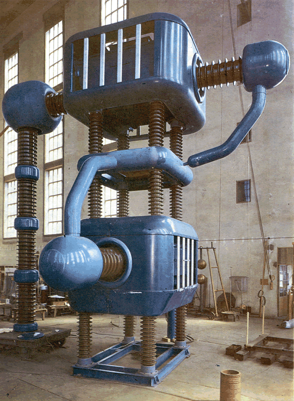 Fig 24.2 A.C. Testing Cascade, 1.2 MV, 1.25 A, short-time operation 4 hours (at an ambient temperature of 350C). Transformer tanks made of sheet aluminum [TUR Dresden]