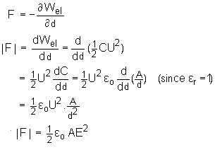 The attracting force F between the plates on area A of the electrodes is equal to the rate of change of stored electrical energy Wel per unit distance in the capacitance formed between the plates.