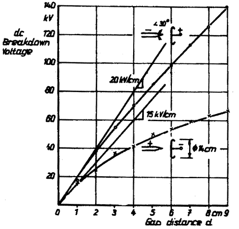 - Uhlmann in his dissertation in 1929 [2.22], measured breakdown voltage characteristics between a 30° point and plane electrode configuration for increasing gap distance with positive as well as negative polarity dc voltages, shown in Fig. 13.2. A strong effect of polarity on the breakdown voltage magnitudes is observed in this case of extremely nonuniform field. The ratio is almost 1:2. The ac (peak) breakdown voltage characteristic would fall nearly in between the positive and negative polarity dc.