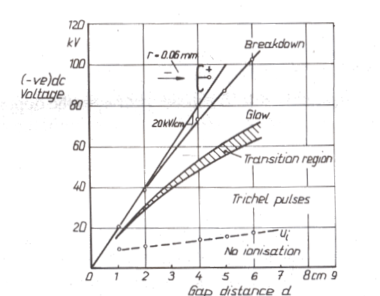- Similar characteristics were measured for negative polarity point-plane electrode with dc for different gap lengths by Kuffel and Zaengl. The point electrode (cathode) is reported to have a radius of 0.06 mm (Fig. 13.3). Below the lowest curve, no conduction current is measurable. The PB and the Trichel pulse inception voltages, Ui, for increasing gap length are given by this curve. As it can be observed, the gap length does not appreciably change the PB inception voltage. On increasing the voltage applied between the two electrodes, the mode of Trichel pulse does not change over a wide range of voltage. The avalanche process is limited within its critical stage, as explained earlier. A steady and stable partial breakdown phenomenon is observed like a 'star' in the dark. On raising the voltage the PB process at the tip of the sharp electrode intensifies, increasing the current density so much that thermal ionization begins. This gives rise to an unstable leader discharge extending instantaneously towards the opposite electrode, accomplishing a spark breakdown with an arc.
