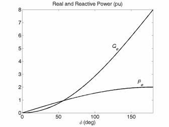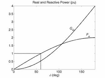 Fig. 10.3 depicts Pe - δ and QQ - δ characteristics. It can be seen from fig 10.4 that for a real power transfer of 1 per unit, a reactive power injection of roughly 0.5359 per unit will be required from the shunt compensator if the midpoint voltage is regulated as per (10.1). Similarly for increasing the real power transmitted to 2 per unit, the shunt compensator has to inject 4 per unit of reactive power. This will obviously increase the device rating and may not be practical. Therefore power transfer enhancement using midpoint shunt compensation may not be feasible from the device rating point of view.