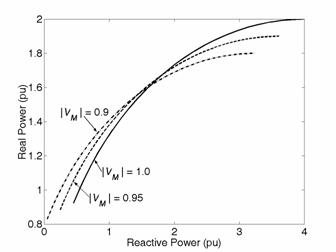 Let us now relax the condition that the midpoint voltage is regulated to 1.0 per unit. We then obtain some very interesting plots as shown in Fig. 10.5. In this figure, the x-axis shows the reactive power available from the shunt device, while the y-axis shows the maximum power that can be transferred over the line without violating the voltage constraint. There are three different P-Q relationships given for three midpoint voltage constraints. For a reactive power injection of 0.5 per unit, the power transfer can be increased from about 0.97 per unit to 1.17 per unit by lowering the midpoint voltage to 0.9 per unit. For a reactive power injection greater than 2.0 per unit, the best power transfer capability is obtained for VM = 1.0 per unit. Thus there will be no benefit in reducing the voltage constraint when the shunt device is capable of injecting a large amount of reactive power. In practice, the level to which the midpoint voltage can be regulated depends on the rating of the installed shunt device as well the power being transferred.