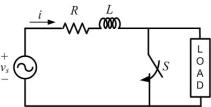 Now consider the single-phase circuit of Fig. 6.5 where Vs = 240 V (rms), the system frequency is 50 Hz, R = 0.864 Ω, L = 11 mH ( ωL = 3.46 Ω ) and the load is R-L comprising of an 8.64 W resistor and a 49.5 mH inductor ( ωL = 15.55Ω ). With the system operating in the steady state, the switch S is suddenly closed creating a short circuit. The current (i ) waveform is shown in Fig. 6.6. The current phasor before the short circuit occurs is