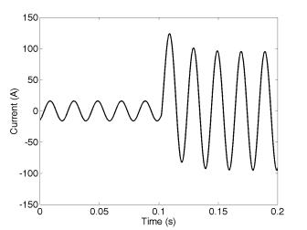 This current has a peak value of 95.28 A. However it can be seen that the current rises suddenly and the first peak following the fault is 124 A which is about 30% higher than the post-fault steady-state value. Also note that the peak value of the current will vary with the instant of the occurrence of the fault. However the peak value of the current is nearly 8 times the pre-fault current value in this case. In general, depending on the ratio of source and load impedances, the faulted current may shoot up anywhere between 10 and 20 times the pre-fault current.