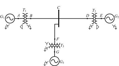 The positive sequence network is shown in Fig. 7.18. This is essentially same as that shown in Fig. 1.24. The negative sequence diagram, shown in Fig. 7.19, is almost identical to the positive sequence diagram except that the voltage sources are absent in this circuit. The zero sequence network is shown in Fig. 7.20. The neutral point of generator G1 is grounded. Hence a path from point A to the ground is provided through the zero sequence reactance of the generator. The primary side of the transformer T1 is Δ -connected and hence there is discontinuity in the circuit after point A . Similar connections are also made for generator G2 and transformer T2 . The transmission line impedances are placed between the points B - C , C - D and C - F . The secondary side of transformer T3 is ungrounded and hence there is a break in the circuit after the point F . However the primary side of T3 is grounded and so is the neutral point of generator G3 . Hence the zero sequence components of these two apparatus are connected to the ground.