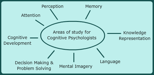 The cognitive psychologists study the various cognitive processes that make up this branch. These processes include attention, the process through which we focus on some stimulus; perception, the process through which we interpret sensory information; pattern recognition, the process through which we classify stimuli into known categories; and memory, the process through which information is stored for later retrieval, and so on. Thus, the work of cognitive psychologists is extended to a number of areas, which can be depicted as follows – |