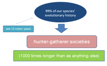 99% of our species evolutionary history since the last 10 million years had been spent in a hunter-gatherer society, so all that has happened after that – be it technology, language or later the industrial revolution or the computer revolution – is minuscule as compared to the 99% of our evolutionary history. What is the implication here? Tooby and Cosmides believe that “that means that our forebearers lived in small, nomadic bands of a few dozen individuals who got all of their food each day by gathering plants or by hunting animals. Each of our ancestors was, in effect, on a camping trip that lasted an entire lifetime, and this way of life endured for most of the last 10 million years.”
