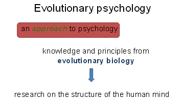 Evolutionary psychology is not a branch so to speak like other branches of psychology are. Evolutionary psychology is rather to be understood as an ‘approach to psychology' in which we look at the mind, the brain, eventually culture and cultural arrangements by borrowing from another domain. This domain is the established domain of evolutionary biology. Knowledge and principles from evolutionary biology are invoked or adopted in a bid to understand the human brain and the mind. These knowledge and principles from evolutionary biology are used for research on the design and structure of the human mind.