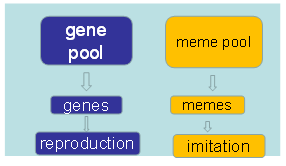 When the analogy is drawn further, it is stretched to include two terms: we all know that we have a gene pool, and the genes are passed through the process of reproduction. By analogy we extend it to the domain of memetics and we say there is a meme pool and through a process of imitation memes move from one brain to another in the same way as the genes by the process of gene reproduction are transmitted to another bodies. This is how Dawkins articulates the process of transmission: