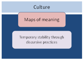 However discourse combines both language and practice and is not simply a power to name. Barker asserts this dual aspect of discourse: “… discourse is said to ‘unite' language and practice and refers to regulated ways of speaking about a subject through which objects and practices acquire meaning” ( Sage Dictionary ). Moreover, if culture refers to maps of meaning created by ideology, these maps achieve a semblance of stability only through discursive practices or culturally sanctioned and codified rules of ways of constructing and organizing knowledge.
