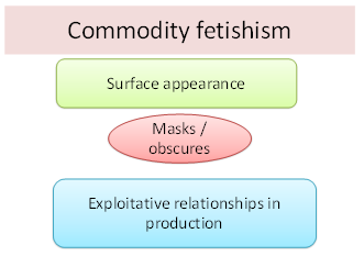 Commodity fetishism is the name Marx gives to the process through which the surface appearance of goods sold in the market place obscures the origins of commodities in an exploitative relationship.