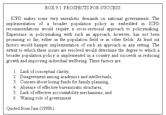 The developing countries have their own problems ( Box 9.1 ). Lack of conceptual clarity and disagreement among the opinion makers, academics and planners is the biggest problem. But there are other problems too: fear of misuse of funds; lack of governance; religious or ethnic resistance; and transfer of responsibilities in the field of family planning and health to private sector, individuals or non-government organizations.