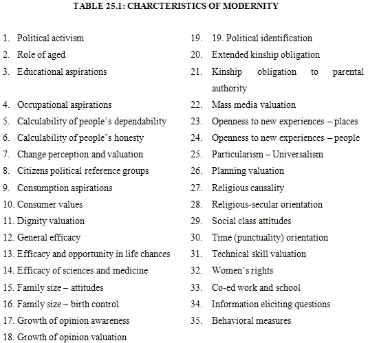 Initially there was a great difficulty in defining “modernity” or modernization. Certain societies were considered to be modern (Was it because they were powerful?) and their observed characteristics constituted the ideal type of a modern society. To understand what attitudes, traits, values, feelings and action patterns can be called modern it is useful to produce the list of themes considered by Smith and Inkeles (1966) in developing the scale of modernity. They are shown in Table 25.1.