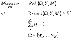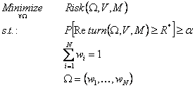 Here the deterministic portfolio optimization problem, (12.4), and the reliable formulation, (12.5), correspond to the general equations (12.2) and (12.3) respectively. N is the universe of assets from which the portfolio is to be formed, Ω, the vector comprising the weights for each of the corresponding asset in the optimal portfolio, M, the vector consisting of the expected returns for the N assets and finally, V, the variance-covariance matrix of the returns of the N assets. In (12.5) the constraint on the returns means that the probability of returns being greater than a certain desired value R* satisfies a given confidence level .