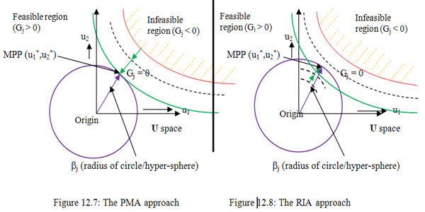 In PMA we calculate the MPP by formulating a minimization problem of the form: Minimize gj(ux, d, up), s.t. and this MPP is identified as the percentile performance level, calculated by , i.e., the gj function evaluated at MPP. There are several methods to solve the MPP problem using PMA method, and that includes optimization techniques, traditional MPP search algorithm based on steepest ascent direction, the diagonal direction method and gradient based method, etc. On the other hand using RIA the MPP is calculated by finding a point which is on the constraint curve in the U-space and is nearest to the origin. The problem formulation corresponding to RIA approach is as follows: Minimize s.t. gj(ux, d, up) = 0. Here we ignore the desired reliability index βj and the minimum U vector on the constraint boundary is found. Afterwards this point thus found is compared with βj to get the optimal point.