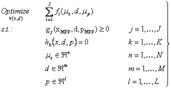 where , , , and are the corresponding mean value vectors and the MPP vectors for the decision and parameter variables respectively. Thus, (12.6) establishes the relation between a probabilistic optimization and a deterministic optimization since the original constraint functions are used to evaluate the design feasibility using the inverse MPPs corresponding to desired reliability . One can refer to Figure 12.9 to understand how a probabilistic constraint is converted to equivalent deterministic constraint.