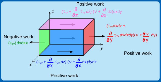 - The left face (green), however, has force due to stress from right to left and 'v' in the left to right direction, making the work negative. It is not possible to show the bottom and back face which also have negative values.