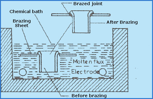 Dip brazing is accomplished by immersing clean and assembled parts into a molten bath contained in a suitable pot. Dip brazing is classified into chemical bath dip brazing and molten metal bath dip brazing. In chemical bath dip brazing the filler metal, in a suitable form, is preplaced and the assembly is dipped in a bath of molten salt, as shown in Figure 4.4.3. The salt bath provides the required heat and necessary protection from oxidation. The salt bath is contained in a suitable pot, also called the furnace, which is heated by electrical resistance. In molten bath dip brazing the parts are immersed in a bath of molten brazing filler metal contained in a furnace. The molten brazing metal flows into the joint by capillary action.