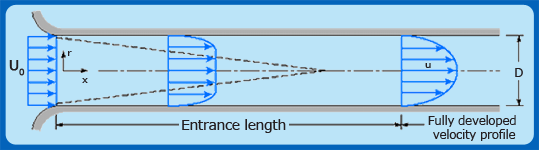 - It has a flat profile at the entrance and develops into a fully developed profile after some distance, called entrance length.