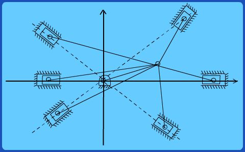A radial engine is one in which all the cylinders are arranged circumferentially as shown in Fig. 4.5. These engines were quite popularly used in aircrafts during World War II. Subsequent developments in steam/gas turbines led to the near extinction of these engines. However it is still interesting to study their state of balance in view of some elegant results we shall discuss shortly. Our method of analysis remains identical to the previous case i.e., we proceed with the assumption that all cylinders are identical and the cylinders are spaced at uniform interval around the circumference. Thus the crank angle for an cylinder will be given by: