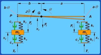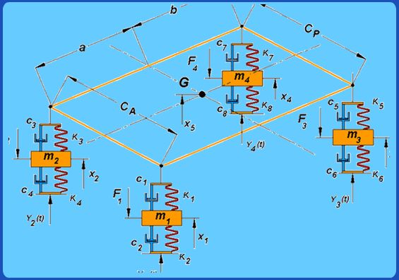 A half-car model shown in Fig. 6.2.4 is a four degree of freedom model where G is the centre of mass. A full car model, on the other hand (Fig. 6.2.5) has several degrees of freedom. |