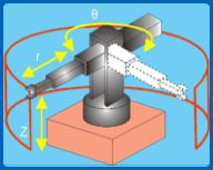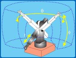 Spherical main body (RRP - Figure 3.2.3) There is a base rotation and a portion of the arm moves in and out (a telescopic motion). The work volume is a portion of a hollow sphere. (Essentially R- q - f motions)