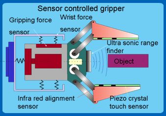 In this gripper the gripper faces move parallel to each other using a parallel bar mechanism. Ultrasonic waves detect whether the object is present and then the fingers close to pick the object. (Figure 3.3.4)