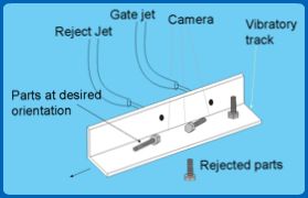 In Fig 3.6.1 and 3.6.2 parts are inspected by a camera and if they are wrongly oriented, rejected for example by blowing a jet of air at them as in Fig. 3.6.1. |