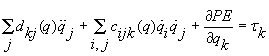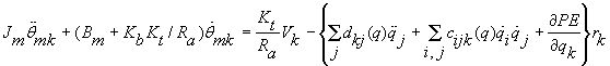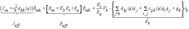 Normally each axis of the manipulator is controlled separately, we will separate the coupling effects due to motion of other links& we will ignore them or treat them as a disturbance.Hence the terms representing Coupled inertias, Coriolis & Centripetal terms are separated & grouped under name dK.While developing control algorithm we will treat this term as disturbance & controller will be designed such that the effects of this disturbance on plant (Robot manipulator) output are reduced. If this is accomplished, then the plant(Robot Manipulator) is said to "reject" the disturbances.This kind of control is known as Independent joint control in which each axis of manipulator is controlled as a single input/single output system. |