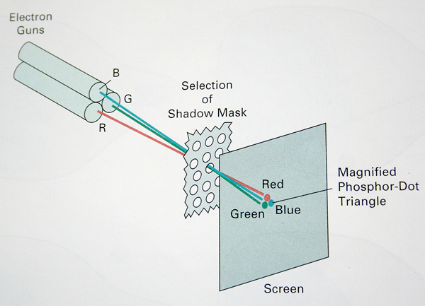 Shadow-mask methods are commonly used in raster-scan systems (including color TV) because they produce a much wider range of color than the beam penetration method. A shadow-mask CRT has three phosphor color dots at each pixel position. One phosphor dot emits a red light, another emits a green light, and the third emits a blue light. This type of CRT has three electron guns, one for each color dot, and a shadow- mask grid just behind the phosphor –coated screen.Fig.below illustrates the delta-delta shadow-mask method, commonly used in color CRT systems. The three electron beam are deflected and focused as a group onto the shadow mask, which contains a series of holes aligned with the phosphor-dot patterns. When the three beams pass through a hole in the shadow mask, they activate a dot triangle, which appears as a small color spot the screen the phosphor dots in the triangles are arranged so that each electron beam can activate only its corresponding color dot when it passes through the shadow mask.