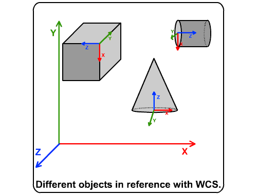 World Coordinate System As discussed above every object have its own MCS relative to which its geometrical data is stored. Incase of multiple objects in the same working space then there is need of a World Coordinate System which relates each MCS to each other with respect to the orientation of the WCS. It can be seen by the picture shown below.