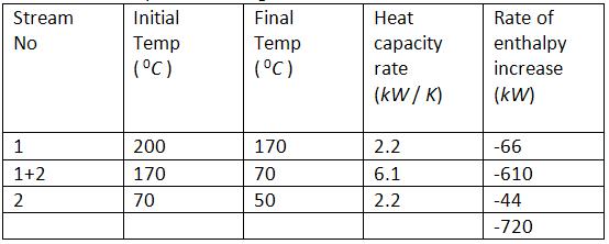 - Stream (1+2) between temperature 170°C to 70°C, a combined stream of thermal capacity rate (2.2+3.9) = 6.1 kW/K
