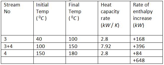 - Stream (3+4) between temperature 100°C to 150°C, a combined stream of thermal capacity rate (2.8+5.12) = 7.92 kW/K