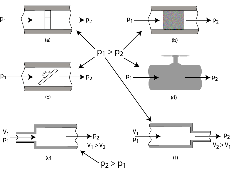 Fig: 1.19 (a) Orifice plate, (b) Porous plug, (Butterfly/throttle Valve ), (d) Any type of flow or pressure control valve (e) sudden expansion, (f) Sudden contraction